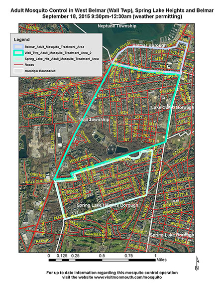 BELMAR, NJ – Continued evidence of West Nile Virus (WNV) activity in sections of Belmar, Spring Lake Heights and Wall Township requires that the Monmouth County Mosquito Control Division conduct mosquito control operations from 9:30 p.m. tonight to 12:30 a.m. on Saturday, Sept. 19.